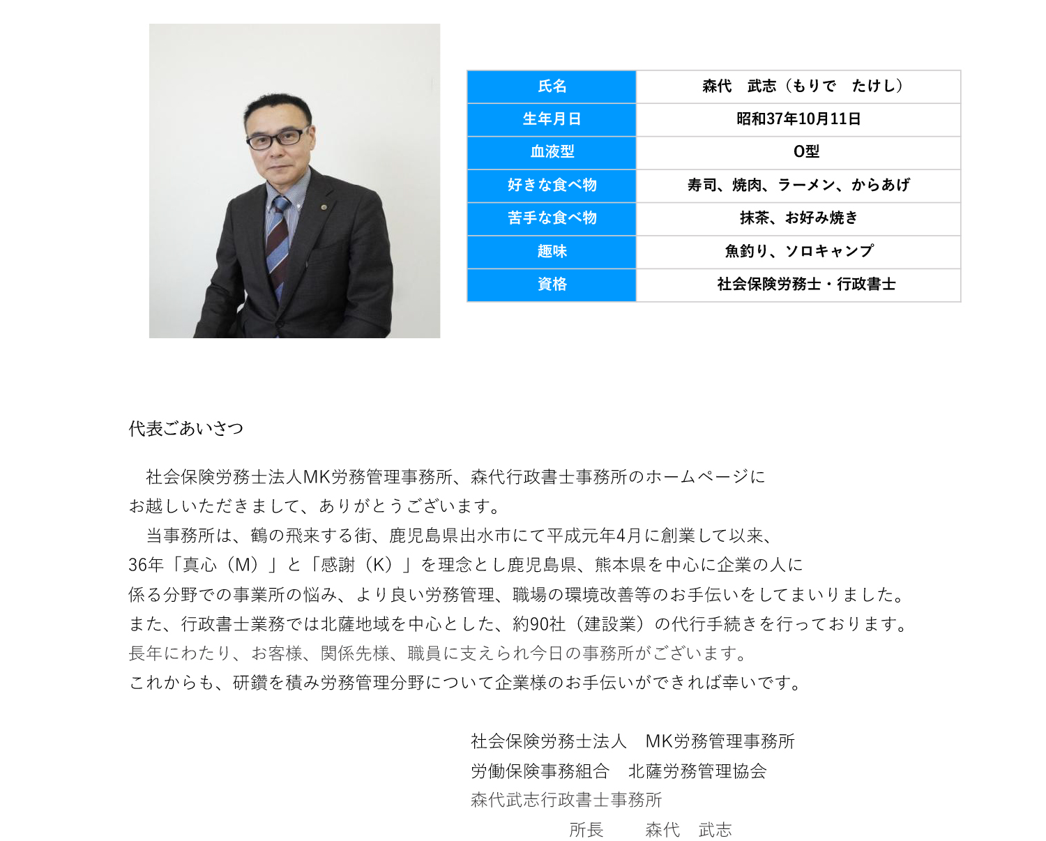 | 代表 | 森代 武志(もりで たけし) |